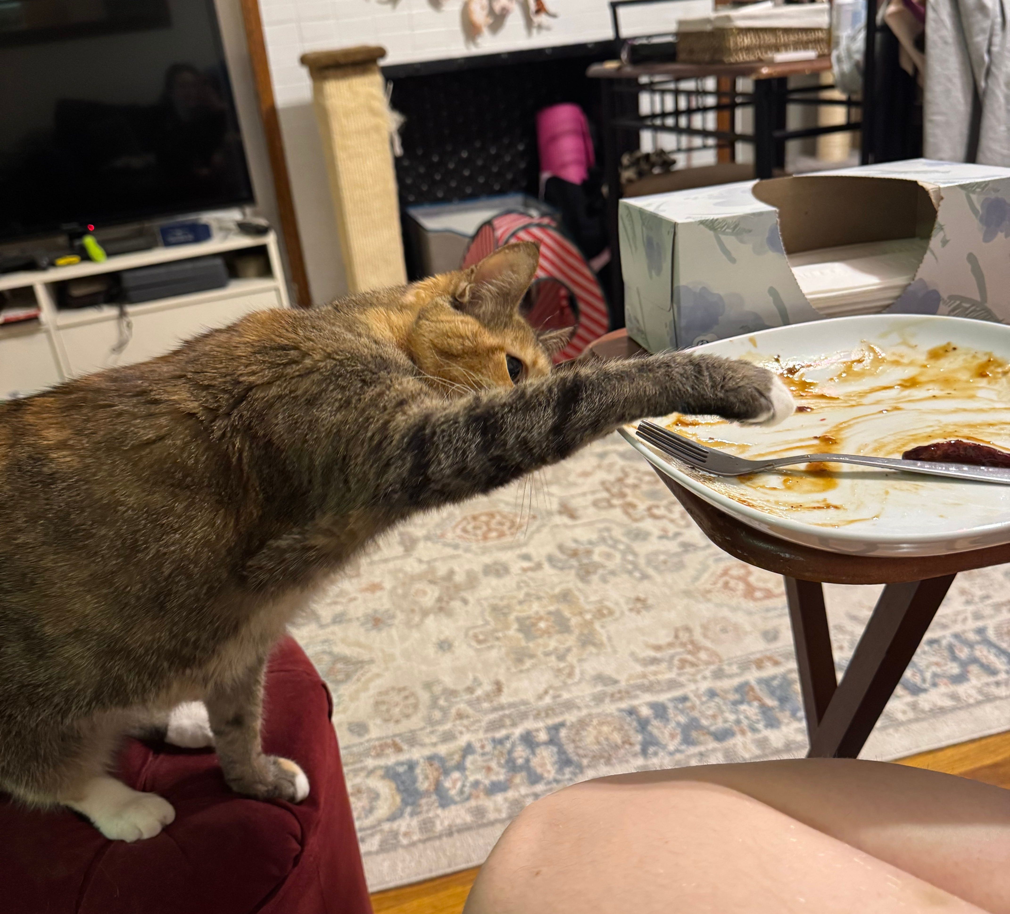 Unlike most cats, I don’t want domination, simply autonomy; I want autonomy to eat all the food I want, and I want to only *barely* dominate my little brother (who will write his own bio when the time comes) because I want him to stay a worthy opponent to me. Food, play and Mommy Snuggles — who needs the world when you have those three? I leave the revolutions to the more politically minded cats, although I obviously support the redistribution of kibble. And yogurt. I LOVE YOGURT.
