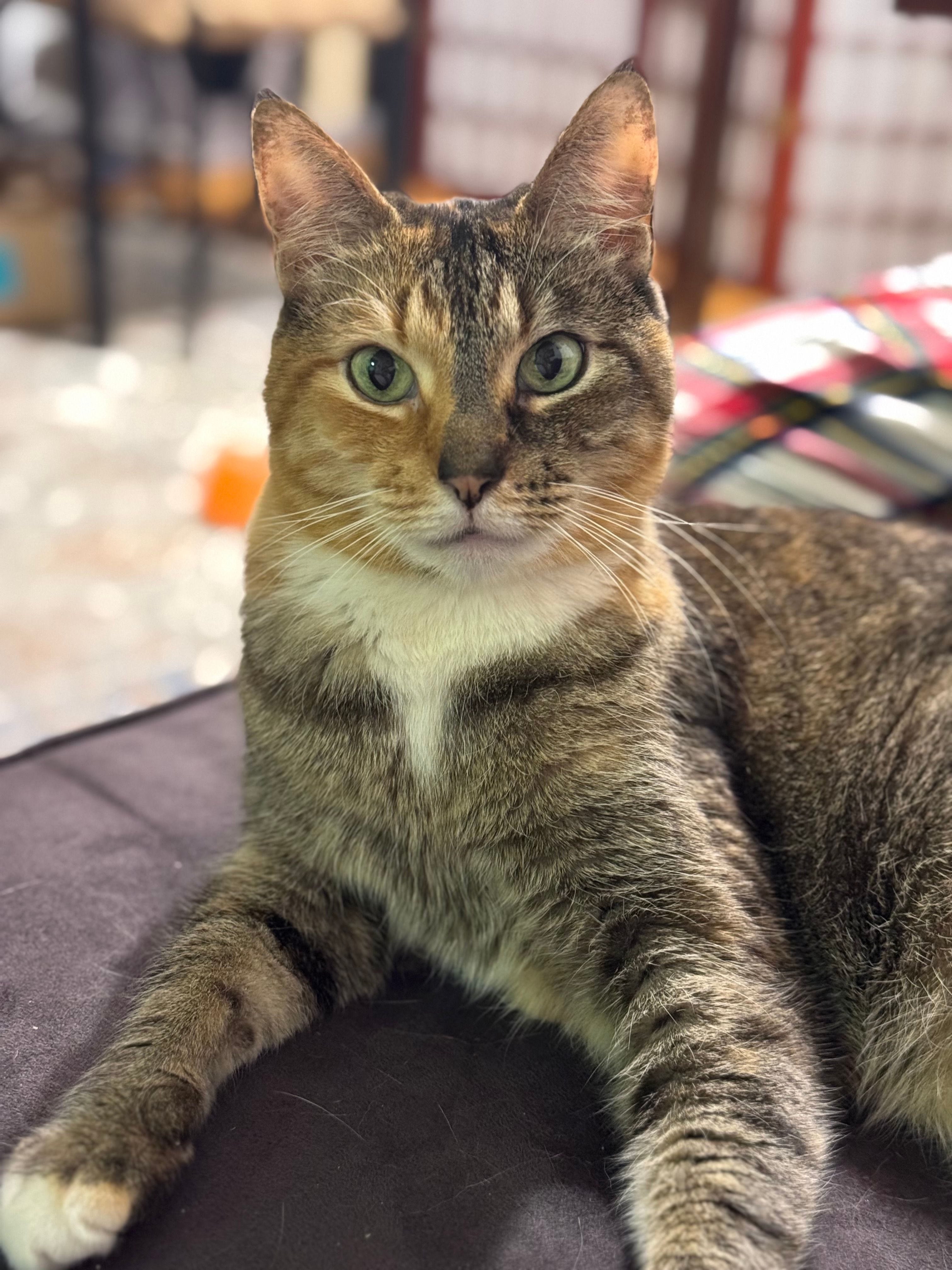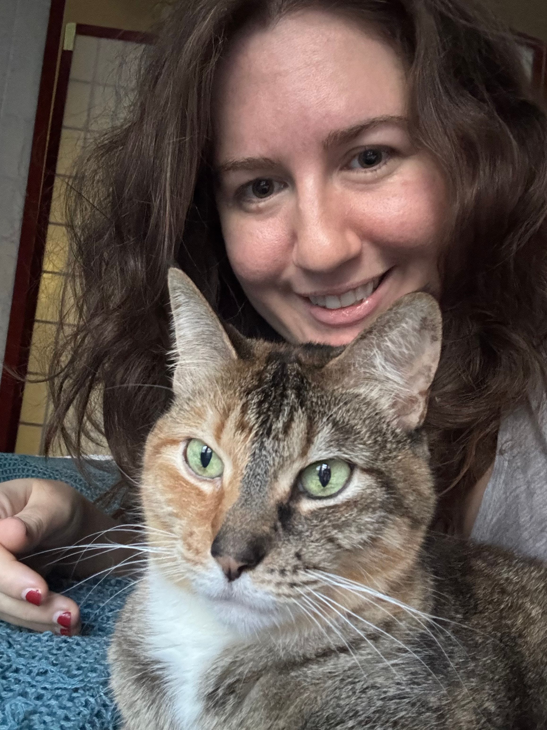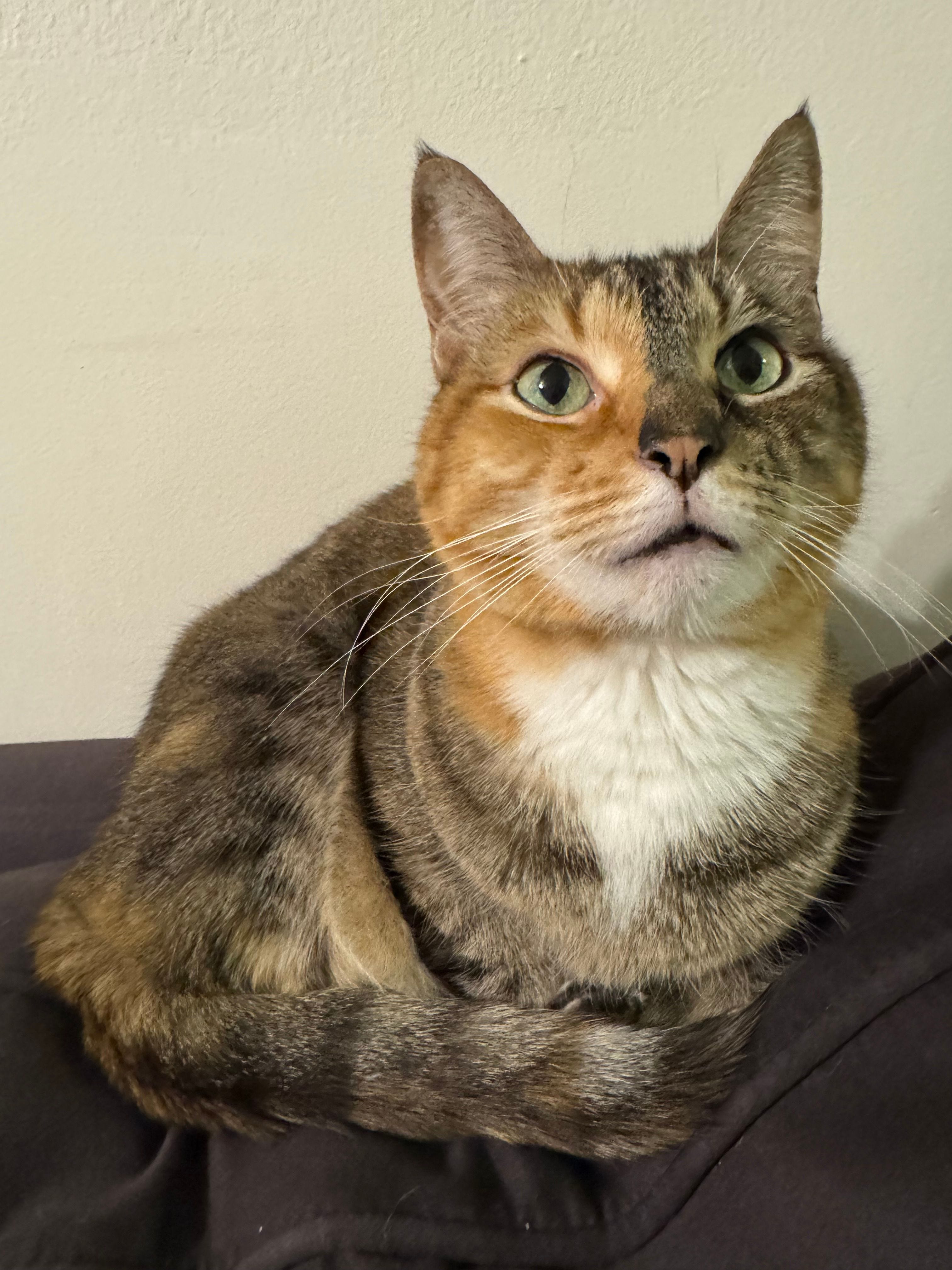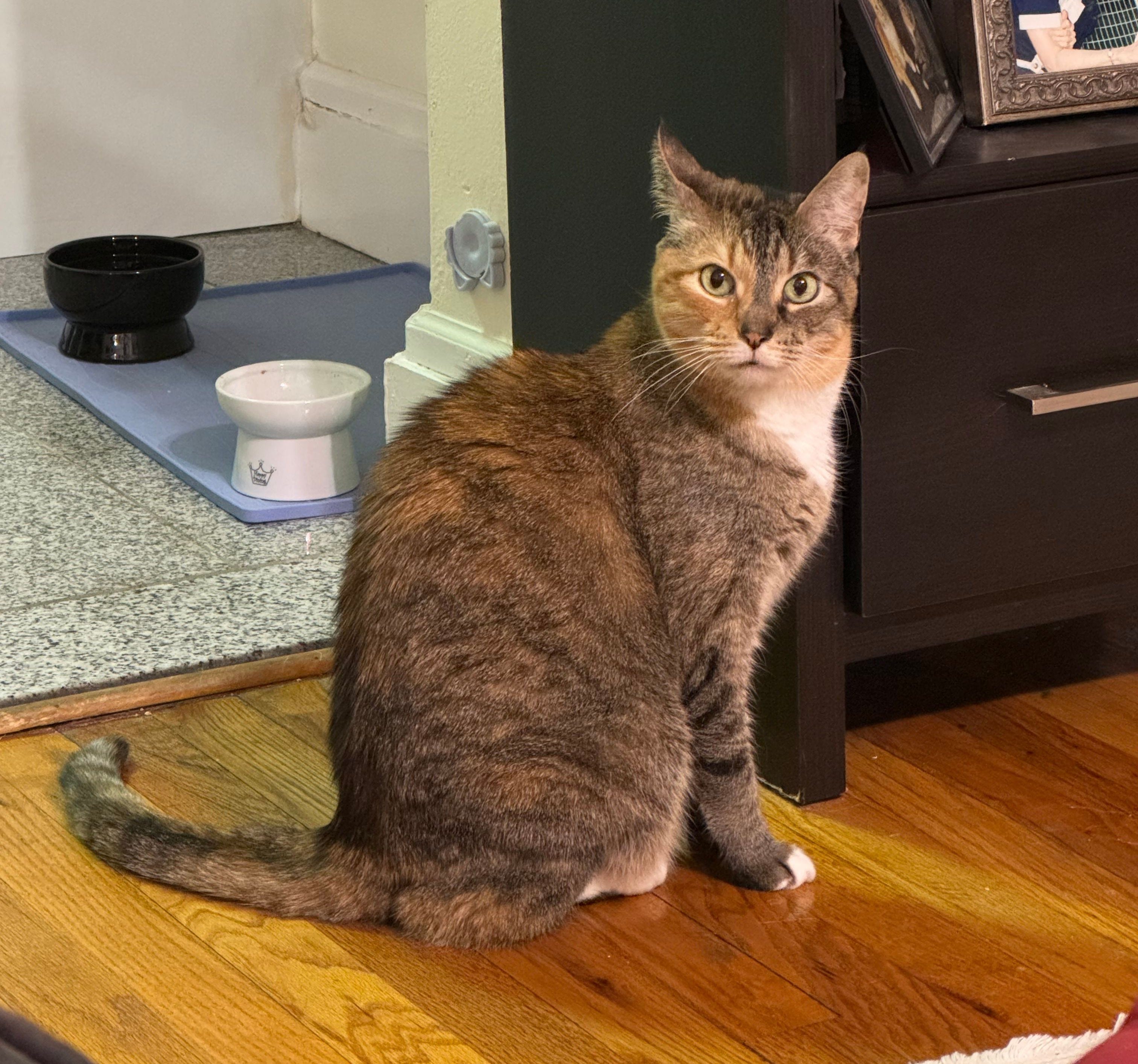 My name is Anita Jean Schaff. I am a two-faced (literally, not figuratively!) tortoiseshell tabby, and the most loyal cat of all time. I take extremely good care of my mother and comfort her with my presence when she is feeling down. I am 11.5 years old and become more playful and braver with every passing year.